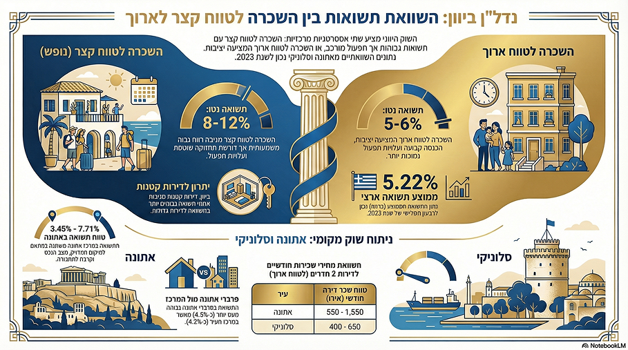 התשואה הצפויה מדירת נופש באתונה נעה בטווח רחב, בהתאם למיקום הנכס ואופן השכרתו: עבור השכרה לטווח קצר (נדל"ן נופש ותיירות), התשואה הפוטנציאלית יכולה להגיע ל-8-12%.