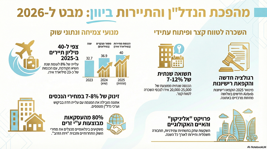 למרות המגבלות החדשות, התחזית לענף נותרת אופטימית: עם צפי של עלייה מתמשכת במספר התיירים, הביקוש להשכרות לטווח קצר צפוי להישאר איתן, במיוחד באזורים התיירותיים המבוקשים. האתגר העיקרי יהיה למצוא את האיזון הנכון בין צמיחת התיירות לבין שמירה על איכות החיים של התושבים המקומיים.